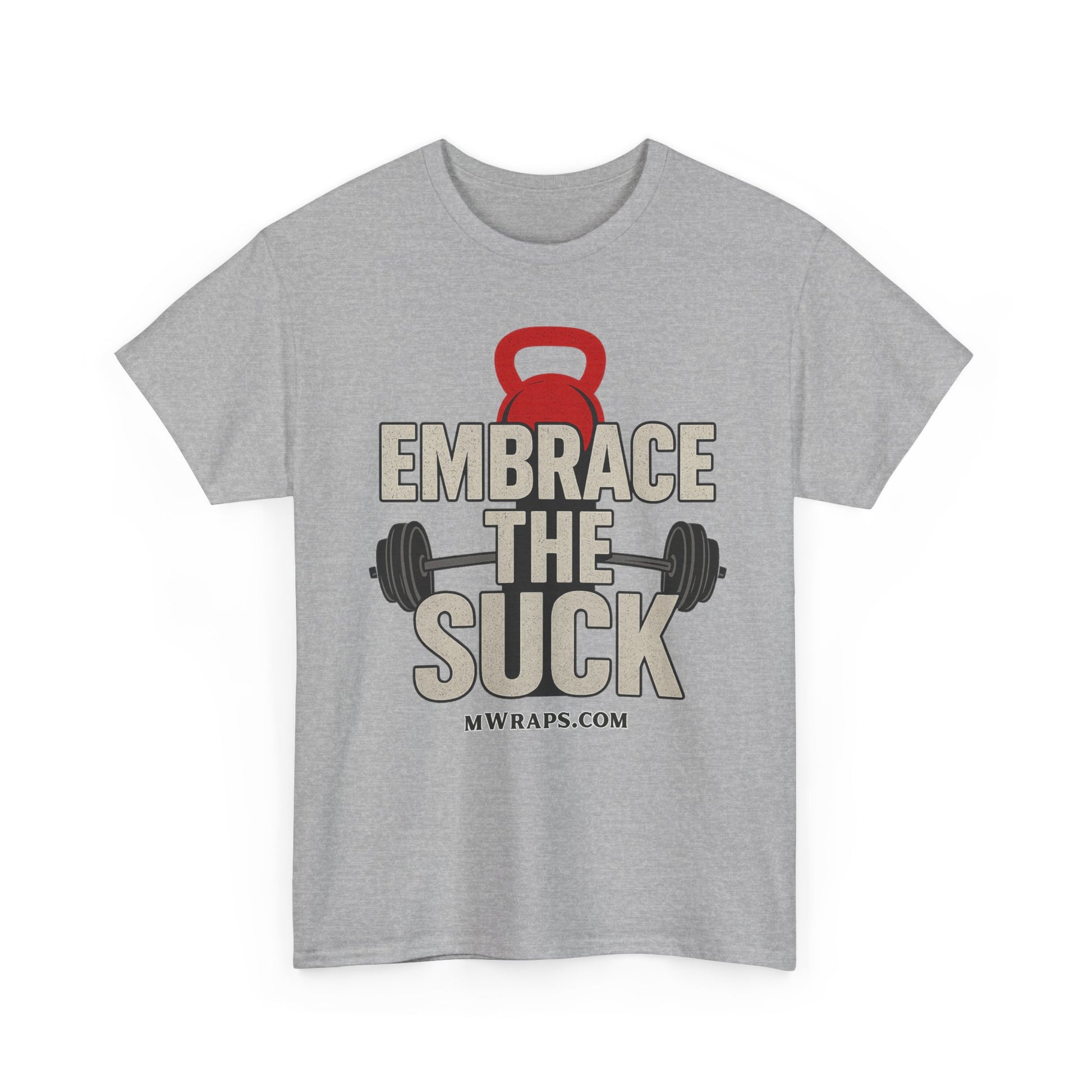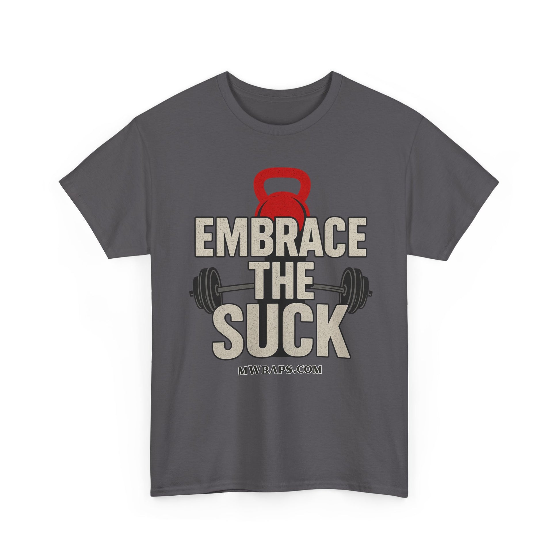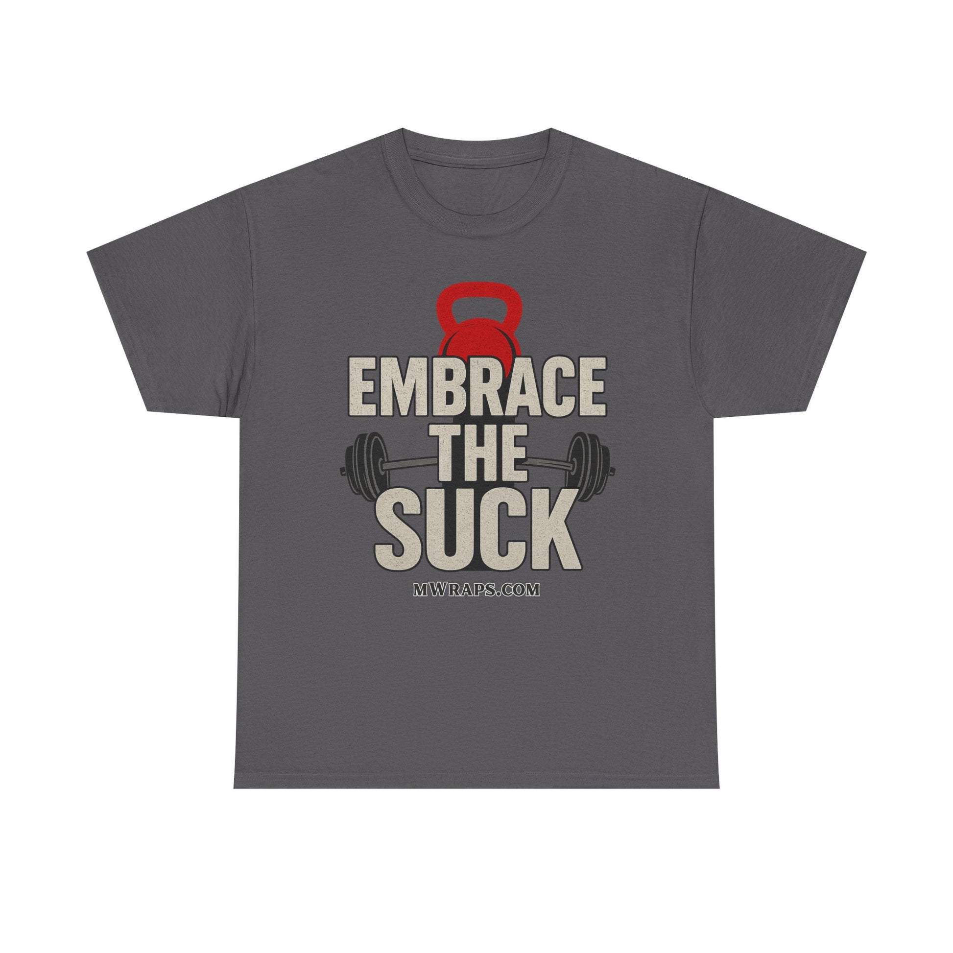 "Embrace The Suck" Gym T-Shirt – Motivational Workout Tee with Kettlebell & Barbell Graphic