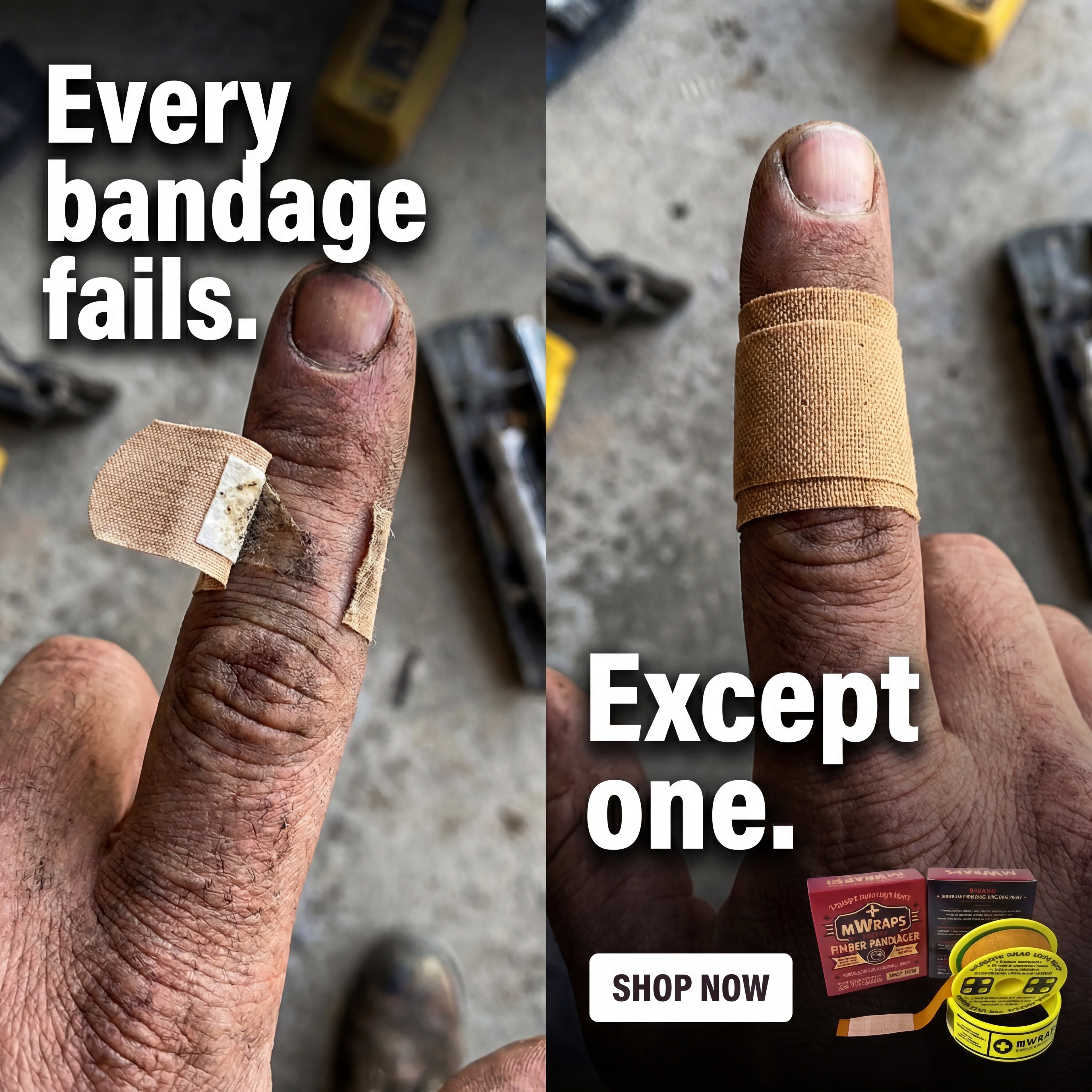 Mwraps™ is the original pro-grade finger bandage roll engineered for tradesmen, mechanics, and anyone who needs long-lasting protection. Each spool contains 48 neutral beige, pre-perforated bandages sized at 3/4" x 6" with a 2" cotton absorbent pad and extended adhesive tail that wraps fully around fingers, knuckles, and fingertips for unmatched retention.The spool design works just like tape —dispense a bandage with one hand, wrap, tear, and keep working. Whether you’re turning a wrench, swinging a hammer, wearing gloves, or washing your hands, Mwraps™ finger bandages stay